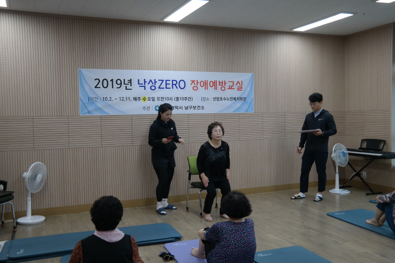 2019년 10월 2일부터 12월 11일까지 (매주 수요일, 10회 실시, 10:00~11:00) 복지관 어르신 15명과 함께 4층 문화교실2에서 '낙상ZERO 장애예방교실'을 실시합니다.