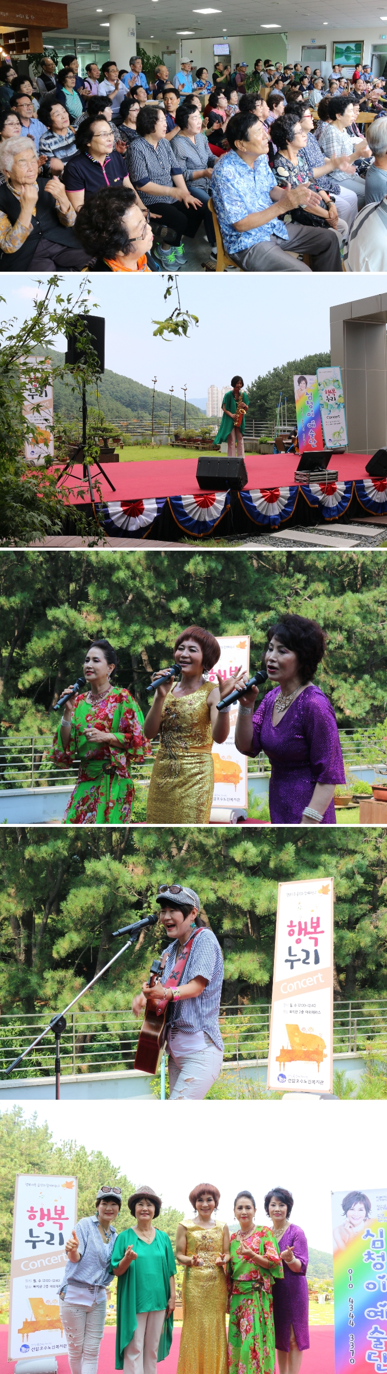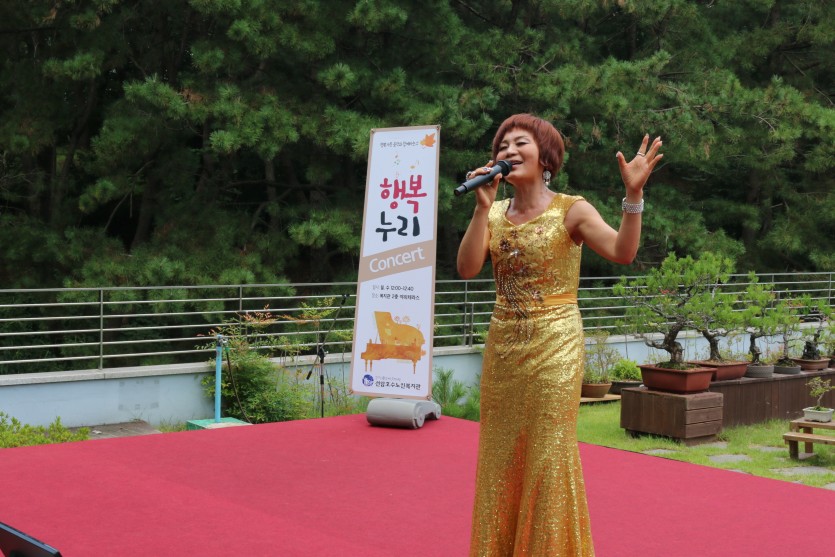 9/9(월) 선암호수노인복지관 2층 야외테라스 무대에서 세번째 콘서트가 열렸습니다. 오늘 공연은 ‘심청이 예술단’에서 가요, 색소폰, 통기타연주 등 다양한 무대를 준비해 어르신들을 즐겁게 해주었습니다.