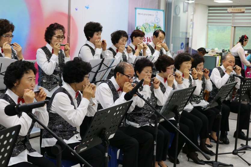 오늘 공연은 선암호수 노인복지관 평생학습 동아리 해바라기 합주단에서 하모니카 연주를 선보였으며, 소리랑 국악교실의 품바공연으로 이루어 졌습니다.
