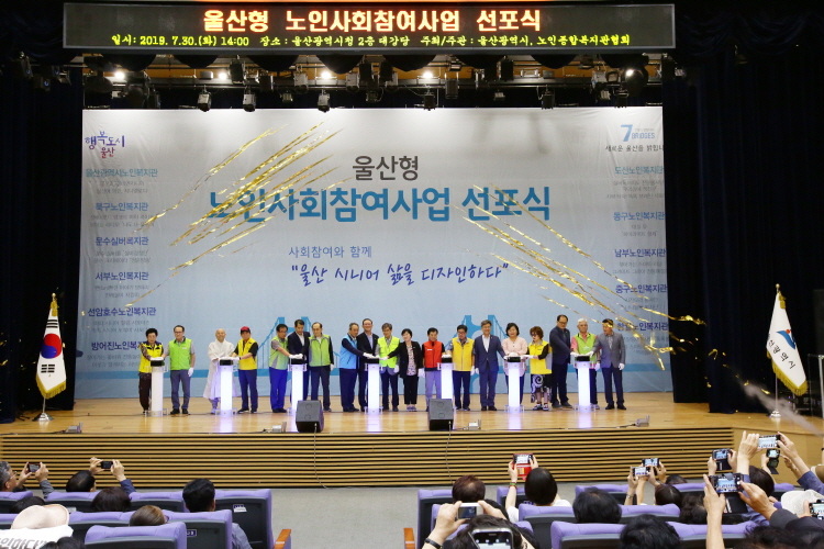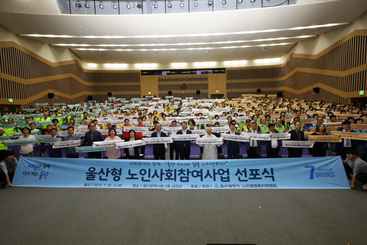 2019.07.30.(화) 울산광역시노인종합복지관협회 주관으로 울산광역시청 본관 대강당에서 풍부한 사회활동 경험 및 재능을 보유하신 어르신들의 인적자원을 지역사회에 환원하기 위해 시작된 울산형 사회참여사업 선포식이 개최되었습니다.
