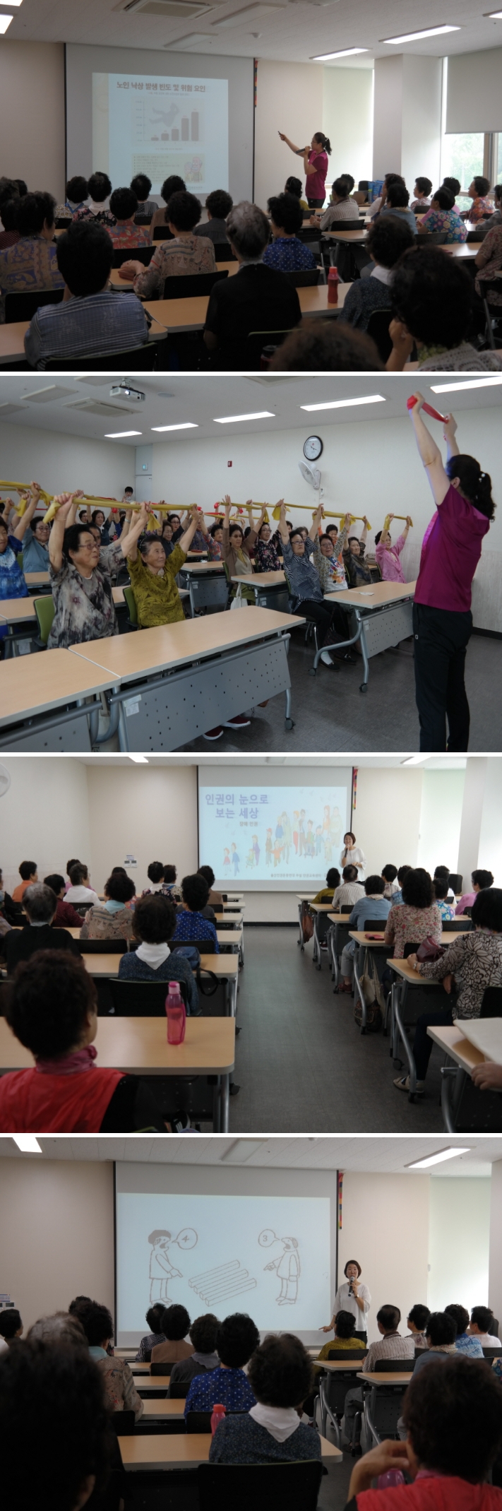 이날은 남구보건소 연계 최정희 강사님의 "허약 및 낙상예방"으로 안전교육을 실시하였고, 두번째 강의는 울산인권운동연대 김가연 강사님의 "장애인인식개선" 활동교육을 실시하였습니다.