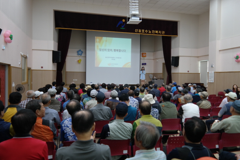 2019년 7월 5일(금) 10시부터 복지관 어르신들을 대상으로 1층 대강당에서 '치매 예방법' 건강강좌를 실시 하였습니다. 이번 건강강좌는 '남구보건소'와 연계하여 '울산광역치매센터 교육홍보팀 '에서 어르신들의 정신건강 관리를 위해 진행되었습니다. 치매 예방의 가장 좋은 방법인 건강 박수 많이 치셔서 즐겁고 건강한 노후를 보내시길 바랍니다.