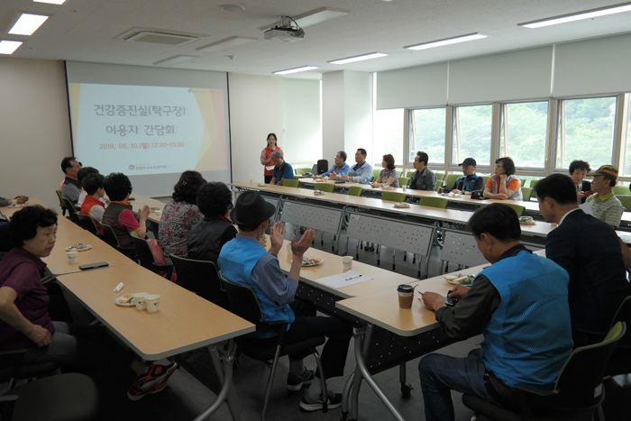 2019년 6월 10일(월) 복지관 3층 배움터2 강의실에서 '2019년 상반기 자율이용시설 건강증진실(탁구장) 이용자 간담회'를 실시하였습니다.
