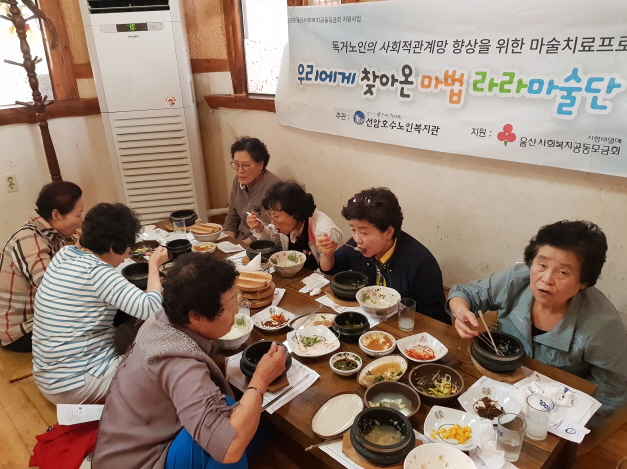 2019년 울산사회복지공동모금회 신청사업으로 진행되는 독거노인의 사회적 관계망 향상을 위한 마술치료 프로그램「우리에게 찾아온 마법 ‘라라마술단’」의 참여자 15명을 대상으로 6/14(금), 12:00~13:00 복지관 인근 식당에서 구성원간 원활한 상호작용을 위해 간담회를 진행하였습니다. 간담회를 통해 활동에 대한 의견을 공유하고 어르신들의 지속적인 참여 동기를 강화 시킬 수 있었습니다.