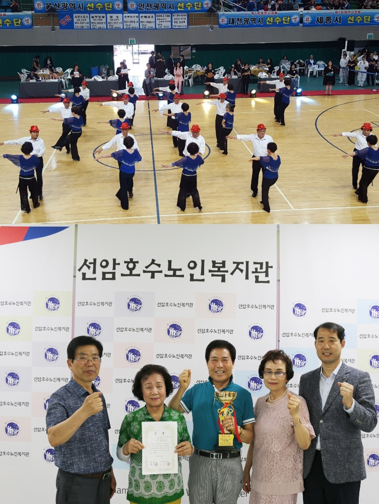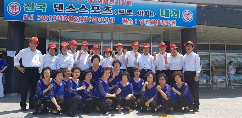 2019.05.26(일) 대한민국 댄스스포츠 연맹, 영천시 주최/경상북도댄스스포츠 연맹, 영천시댄스스포츠 연맹 주관으로 열린 제1회 영천시장배 전국 댄스스포츠 경기대회에서 댄스스포츠 수강 어르신 30명이 대표로 참가하여 평소 연 마한 기량을 유감없이 발휘하여 최우수상을 수상하였습니다.