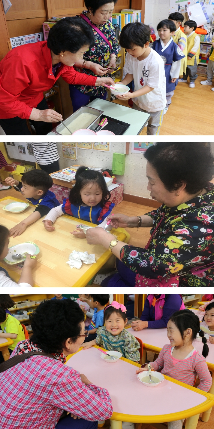 뜨거운 스프에 아이들이 다치치않게 어르신들이 보살펴주시고,