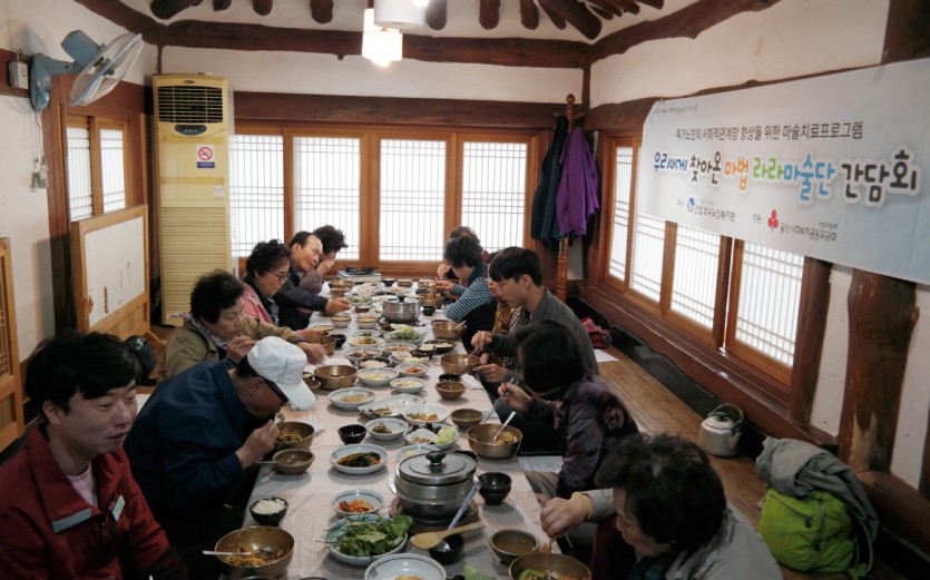 2019년 울산사회복지공동모금회 신청사업으로 진행되는 독거노인의 사회적 관계망 향상을 위한 마술치료 프로그램「우리에게 찾아온 마법 ‘라라마술단’」의 참여자 15명을 대상으로 4/12(금), 12:00~13:00 복지관 인근 식당에서 구성원간 원활한 상호작용을 위해 간담회를 진행하였습니다.