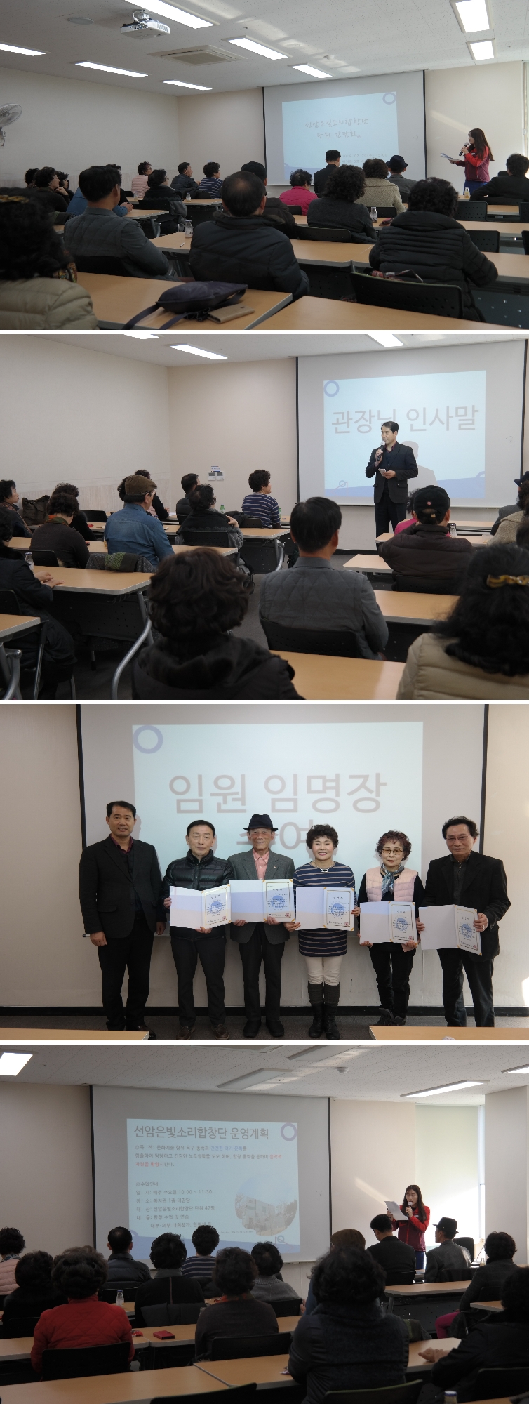 관장님 인사말, 임원 임명장 수여식, 운영계획 및 운영규정 안내, 질의응답 순으로 진행 되었는데요 질의응답 시간에는 운영규정 내용 확인 및 평소 궁금했던 여러 가지 많은 질문을 통한 궁금증을 해소하는 유익한 시간이 되었습니다. 바쁜 일정에도 간담회에 참석해주신 어르신들에게 감사드리며 앞으로 선암은빛소리합창단의 빛나는 발전을 위해 노력하겠습니다.^^