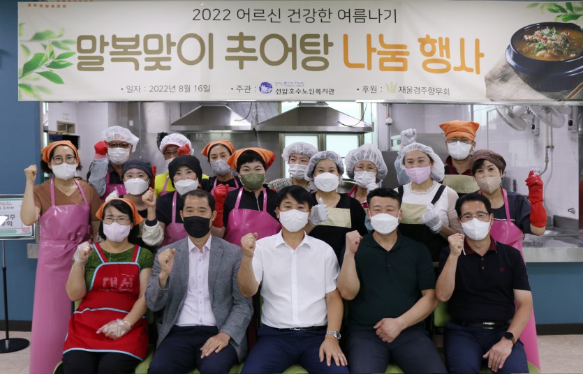 2022년 8/16(화)말복을 맞이하여 어르신들의 건강한 여름 나기를 위한 추어탕 나눔 행사가 진행되었습니다. 재울경주향우회(정성화회장)가 후원하고 선암호수노인복지관에서 주관하여 뜻 깊은 행사가 되었고 맛있는 추어탕이 어르신들의 만족스러운 마음과 더불어 건강을 기원하는 행사가 되었습니다 .