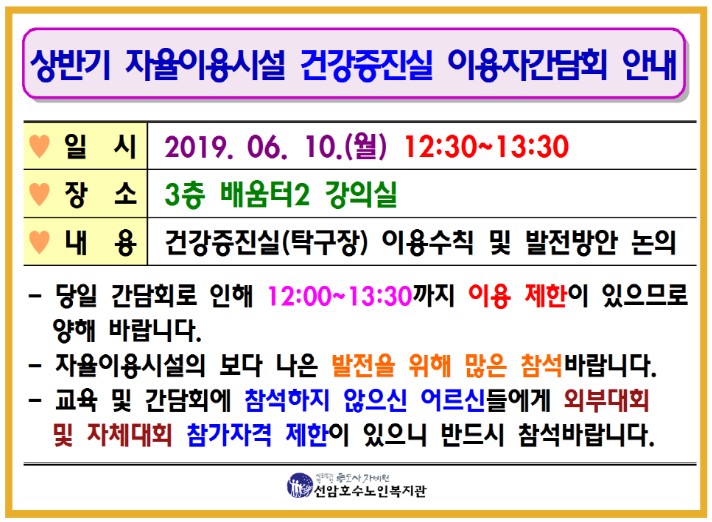 상반기 자율이용시설 건강증진실(탁구장) 이용자 간담회 안내 [2019-05-29]