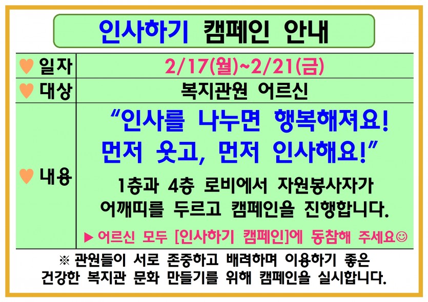 인사하기 캠페인 안내 페이지 정보 작성자 선암호수노인복지관 댓글 0건 조회Hit 476회 작성일Date 25-02-05 15:00 본문 인사하기 캠페인 안내 목록 댓글목록 댓글목록 등록된 댓글이 없습니다.
