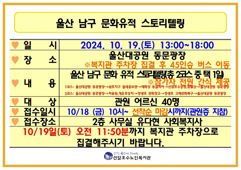 지역사회행사-울산 남구 문화유적 스토리텔링 행사 참여자 모집 페이지 정보 작성자 선암호수노인복지관 댓글 0건 조회Hit 439회 작성일Date 24-10-17 17:59 본문 어르신들의 많은 관심과 참여바라겠습니다 *^^*~ 목록 댓글목록 댓글목록 등록된 댓글이 없습니다.