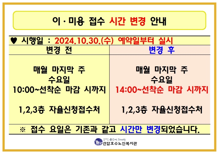 이∙미용 서비스 접수 시간 변경 안내 페이지 정보 작성자 선암호수노인복지관 댓글 0건 조회Hit 439회 작성일Date 24-10-18 11:03 본문 10/30(수) 예약일부터 변경 됩니다 *^^*11월 이∙미용 서비스 예약시 착오없으시길 바랍니다.요 일: 기존과 동일예약시간: 10:00 -> 14:00 변경 목록 댓글목록 댓글목록 등록된 댓글이 없습니다.