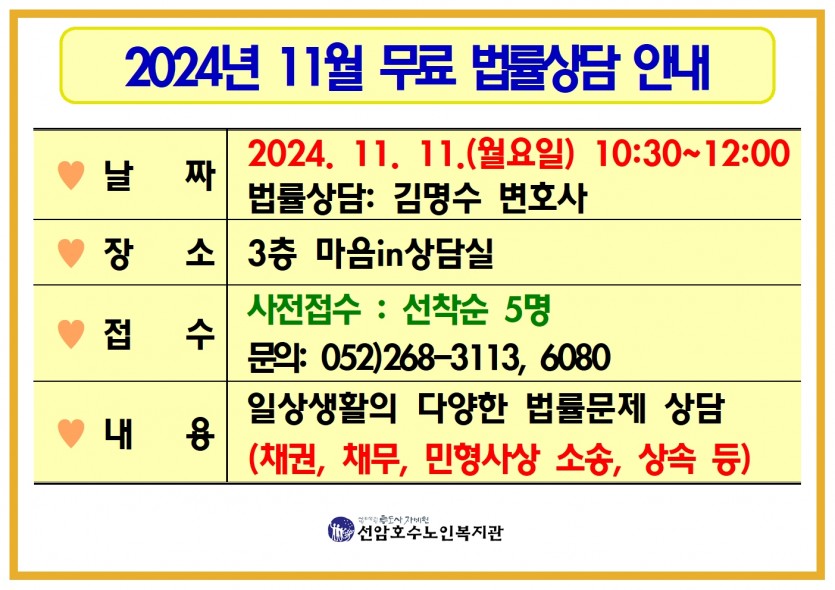 2024년 11월 무료 법률상담 실시 안내 페이지 정보 작성자 선암호수노인복지관 댓글 0건 조회Hit 449회 작성일Date 24-10-18 16:23 본문 2024년 11월 11일 무료 법률상담을 실시하고자 합니다..관원들의 많은 관심과 신청 바랍니다 목록 댓글목록 댓글목록 등록된 댓글이 없습니다.