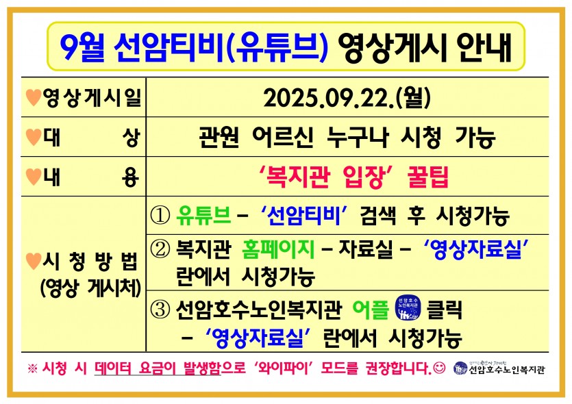 [복지관 입장 꿀팁] 9월 선암티비(유튜브) 영상게시 *시청 바랍니다*