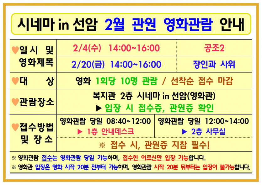 시네마in선암 2월 관원 영화관람 안내 페이지 정보 작성자 선암호수노인복지관 댓글 0건 조회Hit 179회 작성일Date 26-01-26 11:20 본문 시네마in선암 2월 관원 영화관람 안내 목록 댓글목록 댓글목록 등록된 댓글이 없습니다.