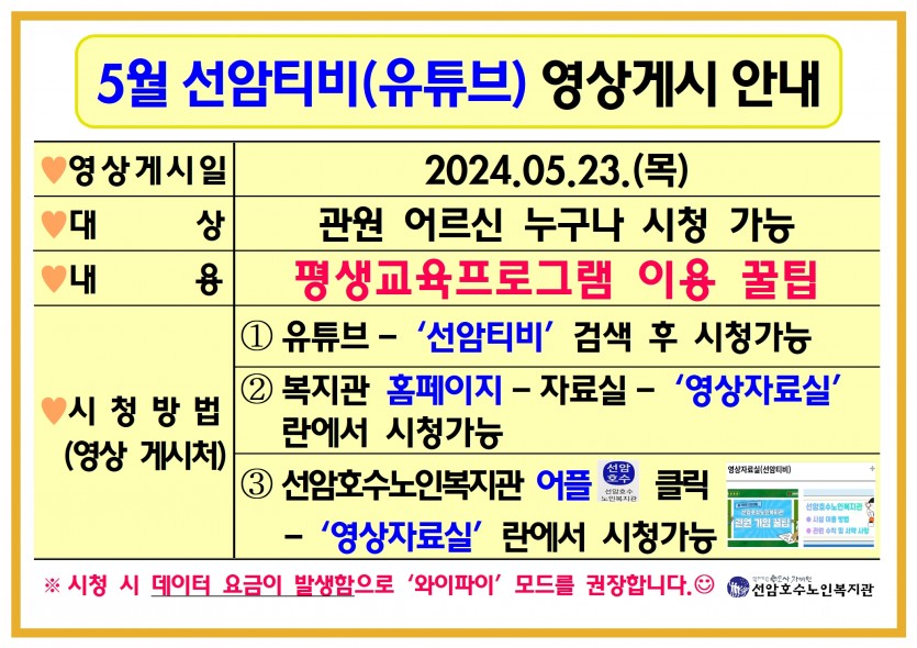 5월 선암티비(유튜브) 영상게시 안내 (시청 바랍니다^^)