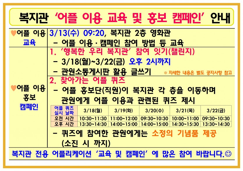 복지관 ‘어플 이용 교육 및 홍보 캠페인’ 안내 페이지 정보 작성자 선암호수노인복지관 댓글 0건 조회Hit 956회 작성일Date 24-03-07 09:29 본문 복지관 전용 어플리케이션 ‘교육 및 캠페인’ 에 많은 참여 바랍니다.☺ 목록 댓글목록 댓글목록 등록된 댓글이 없습니다.