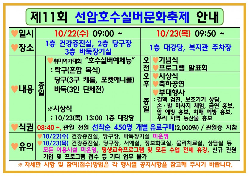 제11회 선암호수실버문화축제 안내 페이지 정보 작성자 선암호수노인복지관 댓글 0건 조회Hit 348회 작성일Date 25-09-16 11:09 본문 즐거운 축제의 장으로 초대합니다! 많은 참여 바랍니다.^-^ 목록 댓글목록 댓글목록 등록된 댓글이 없습니다.