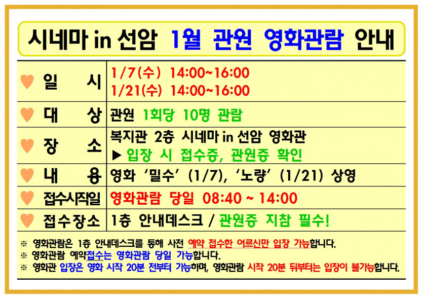 시네마in선암 1월 관원 영화관람 안내 페이지 정보 작성자 선암호수노인복지관 댓글 0건 조회Hit 220회 작성일Date 26-01-05 15:21 본문 시네마in선암 1월 관원대상 영화 상영 목록 댓글목록 댓글목록 등록된 댓글이 없습니다.