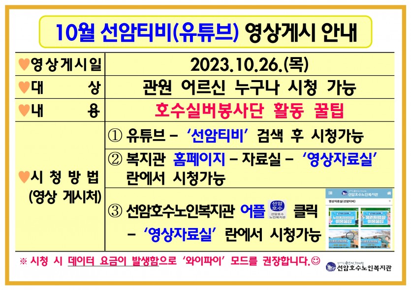 10월 선암티비(유튜브) 영상게시 안내 (시청 바랍니다^^)