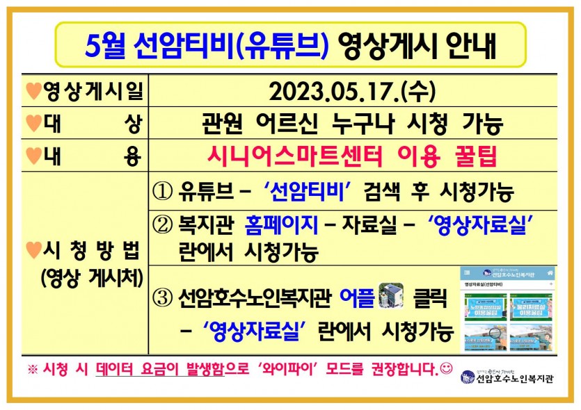 5월 선암티비(유튜브) 영상게시 안내 페이지 정보 작성자 관리자 댓글 0건 조회Hit 475회 작성일Date 23-05-17 12:23 본문 선암티비 '시니어스마트센 이용 꿀팁' 영상 바로가기 ▶ https://youtu.be/6GZJsuBU3Mc 목록 댓글목록 댓글목록 등록된 댓글이 없습니다.
