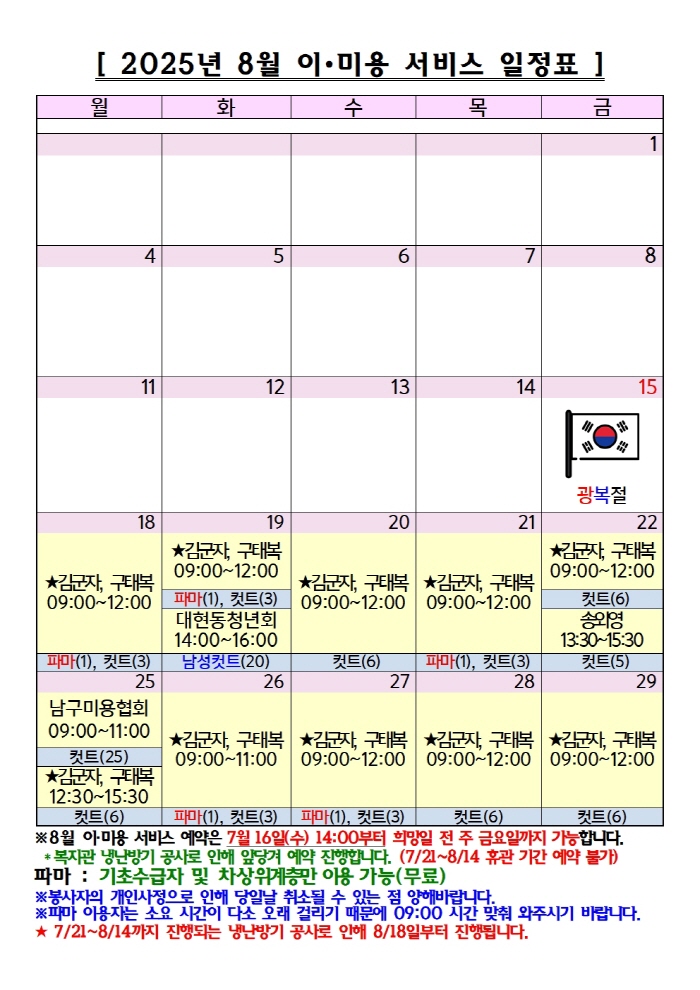 7/21~8/14까지 진행되는 복지관 냉난방기 공사로 인해 접수 일자가 앞당겨졌으며,