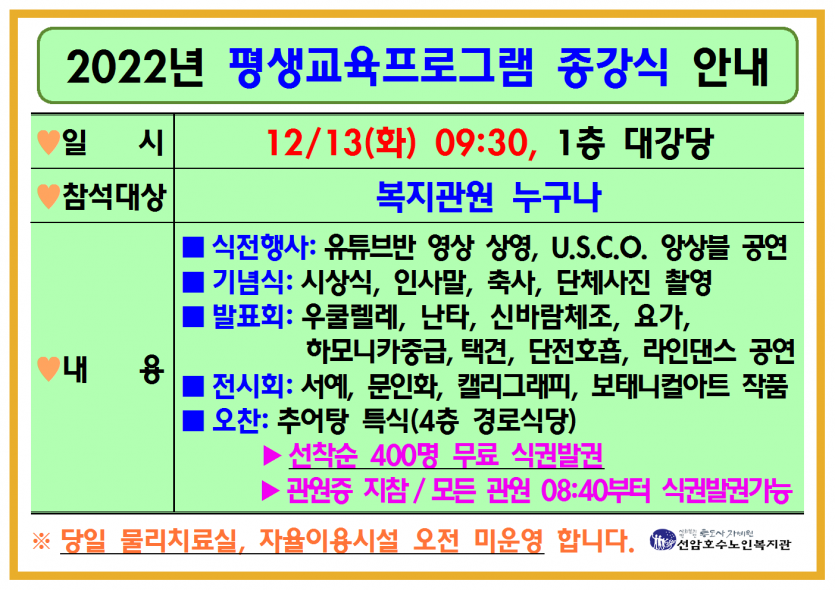 2022년 평생교육프로그램 종강식 안내 페이지 정보 작성자 관리자 댓글 0건 조회Hit 801회 작성일Date 22-11-25 14:13 본문 2022년 평생교육프로그램 종강식 안내 목록 댓글목록 댓글목록 등록된 댓글이 없습니다.