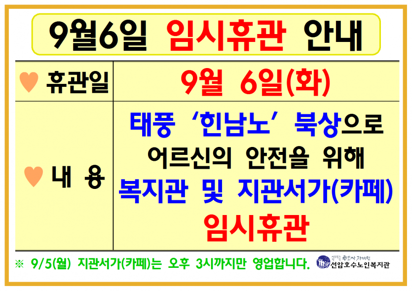 9/6(화) 임시휴관 안내 페이지 정보 작성자 관리자 댓글 0건 조회Hit 784회 작성일Date 22-09-05 11:32 본문 9/6(화) 임시휴관 안내 목록 댓글목록 댓글목록 등록된 댓글이 없습니다.