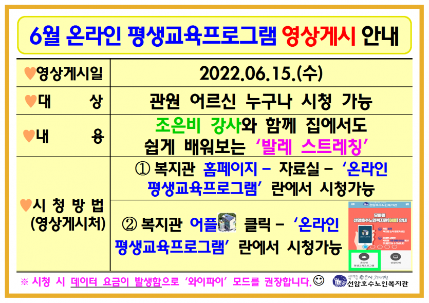 6월 온라인 평생교육프로그램 영상게시 안내(발레 스트레칭) 페이지 정보 작성자 관리자 댓글 0건 조회Hit 796회 작성일Date 22-05-30 08:42 본문 6월 온라인 평생교육프로그램 영상게시 안내(발레 스트레칭) 목록 댓글목록 댓글목록 등록된 댓글이 없습니다.