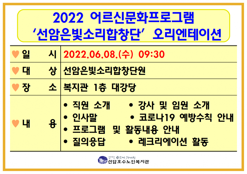 2022 어르신문화프로그램 ‘선암은빛소리합창단’ 오리엔테이션 페이지 정보 작성자 관리자 댓글 0건 조회Hit 569회 작성일Date 22-05-30 10:51 본문 2022 어르신문화프로그램 ‘선암은빛소리합창단’ 오리엔테이션 목록 댓글목록 댓글목록 등록된 댓글이 없습니다.