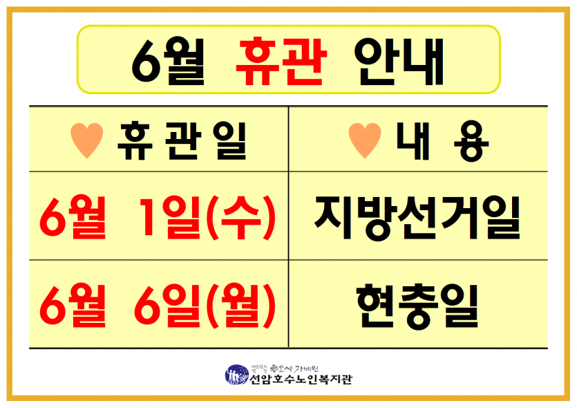 6월 휴관 안내 페이지 정보 작성자 관리자 댓글 0건 조회Hit 657회 작성일Date 22-05-24 08:50 본문 6월 휴관 안내 목록 댓글목록 댓글목록 등록된 댓글이 없습니다.