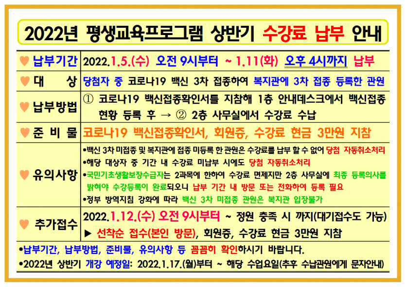 2022년 평생교육프로그램 상반기 수강료 납부 안내 페이지 정보 작성자 관리자 댓글 0건 조회Hit 799회 작성일Date 21-12-29 10:22 본문 ※ 점심시간(12시~13시)에는 수강료 납부 불가합니다. ※ 대기취소 시에도 268-6080 사무실로 반드시 연락해주시기 바랍니다. 목록 댓글목록 댓글목록 등록된 댓글이 없습니다.