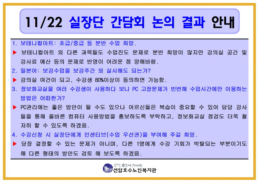 11/22 실장단 간담회 논의 결과 안내 페이지 정보 작성자 관리자 댓글 0건 조회Hit 684회 작성일Date 21-11-25 11:52 본문 11/22 실장단 간담회 논의 결과 안내 목록 댓글목록 댓글목록 등록된 댓글이 없습니다.