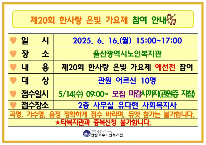 지역사회행사-제20회 한사랑 은빛 가요제 참여자 모집(마감) 페이지 정보 작성자 선암호수노인복지관 댓글 0건 조회Hit 179회 작성일Date 25-05-13 09:47 본문 어르신들의 많은 참여 바랍니다 *^^* 목록 댓글목록 댓글목록 등록된 댓글이 없습니다.