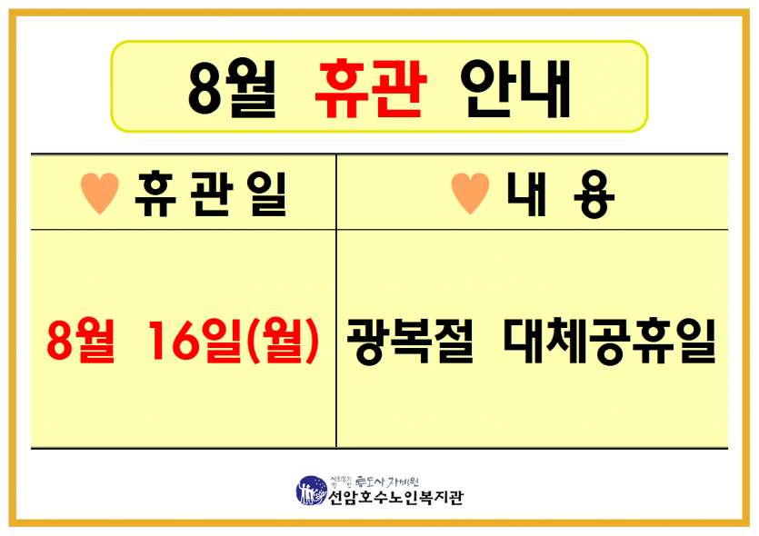 8월 휴관 안내 페이지 정보 작성자 관리자 댓글 0건 조회Hit 919회 작성일Date 21-07-29 09:39 본문 8월 휴관 안내 목록 댓글목록 댓글목록 등록된 댓글이 없습니다.