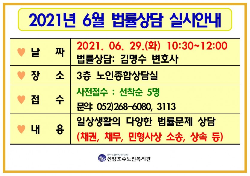 2021년 6월 무료 법률상담 실시안내 페이지 정보 작성자 관리자 댓글 0건 조회Hit 659회 작성일Date 21-06-15 10:46 본문 2021년 6월 무료 법률상담을 실시합니다. 목록 댓글목록 댓글목록 등록된 댓글이 없습니다.