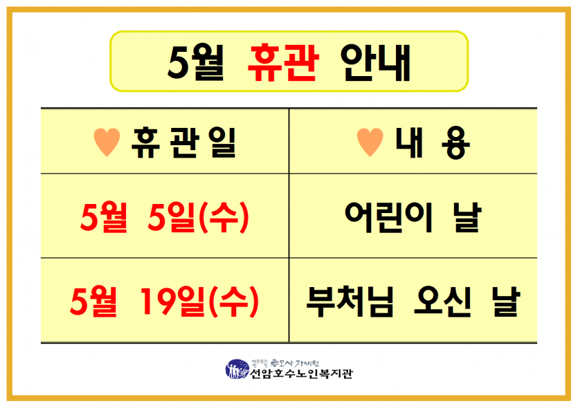 5월 휴관 안내 (5/3(월)부터 ~ 별도 안내 시까지 '임시휴관' 중 입니다.) 페이지 정보 작성자 관리자 댓글 0건 조회Hit 993회 작성일Date 21-04-19 08:56 본문 5월 휴관 안내 목록 댓글목록 댓글목록 등록된 댓글이 없습니다.