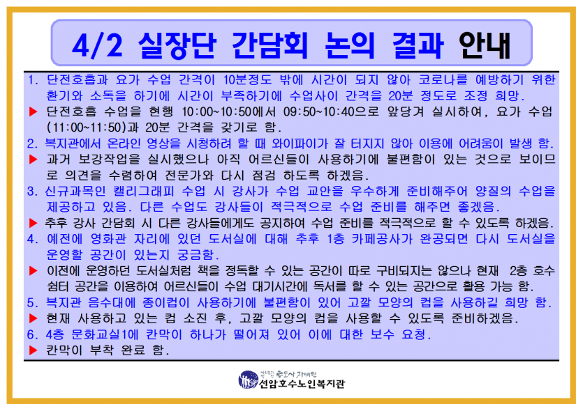 2021년 평생교육프로그램 4월 실장단 간담회 논의 결과 안내 페이지 정보 작성자 관리자 댓글 0건 조회Hit 796회 작성일Date 21-04-09 11:15 본문 2021년 평생교육프로그램 4월 실장단 간담회 논의 결과 안내 목록 댓글목록 댓글목록 등록된 댓글이 없습니다.
