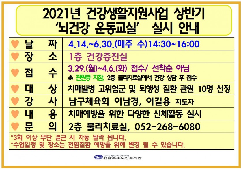 2021년 건강생활지원사업 뇌건강 운동교실 실시 안내 페이지 정보 작성자 관리자 댓글 0건 조회Hit 1,011회 작성일Date 21-03-19 10:44 본문 2021년 건강생활지원사업 뇌건강 운동교실 실시 안내 목록 댓글목록 댓글목록 등록된 댓글이 없습니다.