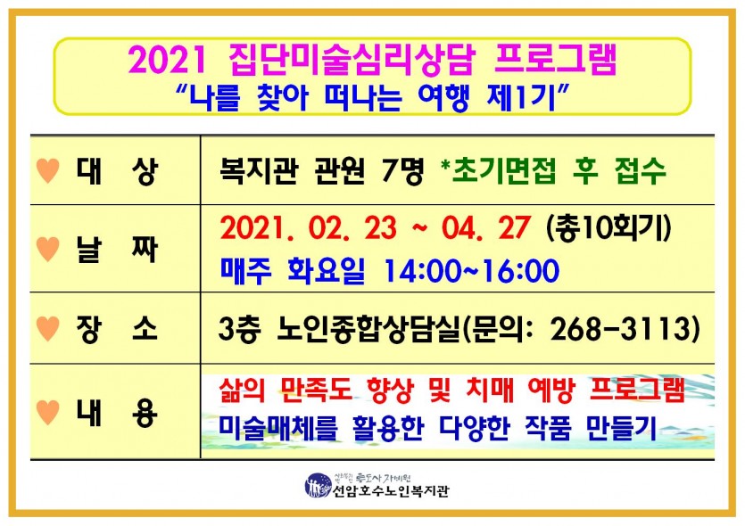 2021년 집단미술심리상담 프로그램 "나를 찾아 떠나는 여행" 참여자 모집 페이지 정보 작성자 관리자 댓글 0건 조회Hit 769회 작성일Date 21-02-03 20:02 본문 2021년 집단미술심리상담 프로그램 참여자를 모집합니다. 목록 댓글목록 댓글목록 등록된 댓글이 없습니다.