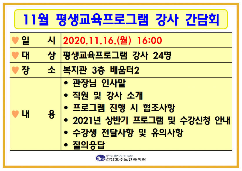 11월 평생교육프로그램 강사 간담회 페이지 정보 작성자 관리자 댓글 0건 조회Hit 713회 작성일Date 20-11-09 17:56 본문 11월 평생교육프로그램 강사 간담회 목록 댓글목록 댓글목록 등록된 댓글이 없습니다.
