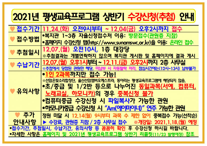 2021년 평생교육프로그램 상반기 수강신청(추첨) 및 변경과목, 환불방법 안내