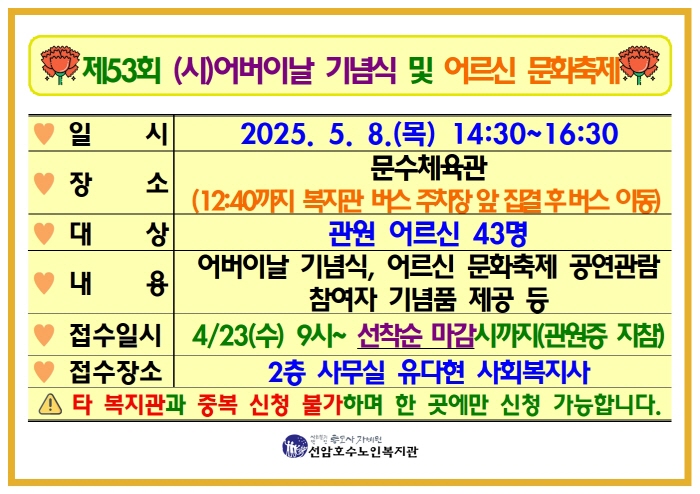 지역사회행사-제53회 (시)어버이날 기념식 및 어르신 문화축제 참여자 모집(마감) 페이지 정보 작성자 선암호수노인복지관 댓글 0건 조회Hit 218회 작성일Date 25-04-17 14:35 본문 어르신들의 많은 관심과 참여 부탁드리겠습니다 *^^* 목록 댓글목록 댓글목록 등록된 댓글이 없습니다.