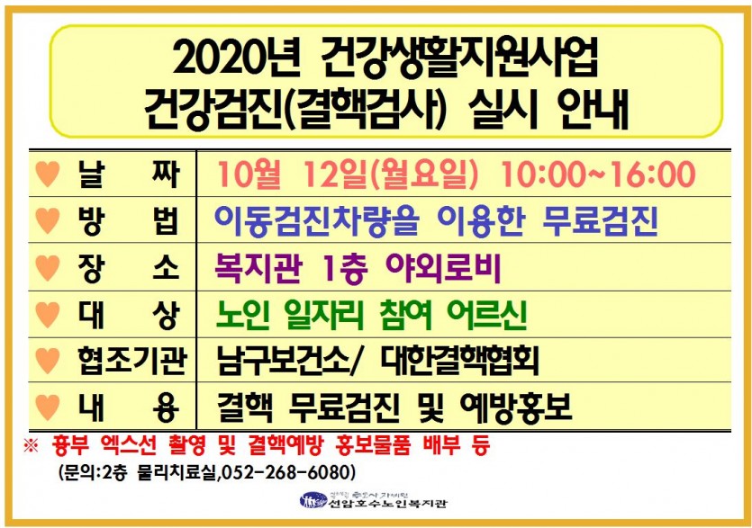 2020년 건강생활지원사업 건강검진(결핵검사) 실시 안내 페이지 정보 작성자 관리자 댓글 0건 조회Hit 858회 작성일Date 20-10-05 18:06 본문 2020년 건강생활지원사업 건강검진(결핵검사) 실시 안내 목록 댓글목록 댓글목록 등록된 댓글이 없습니다.