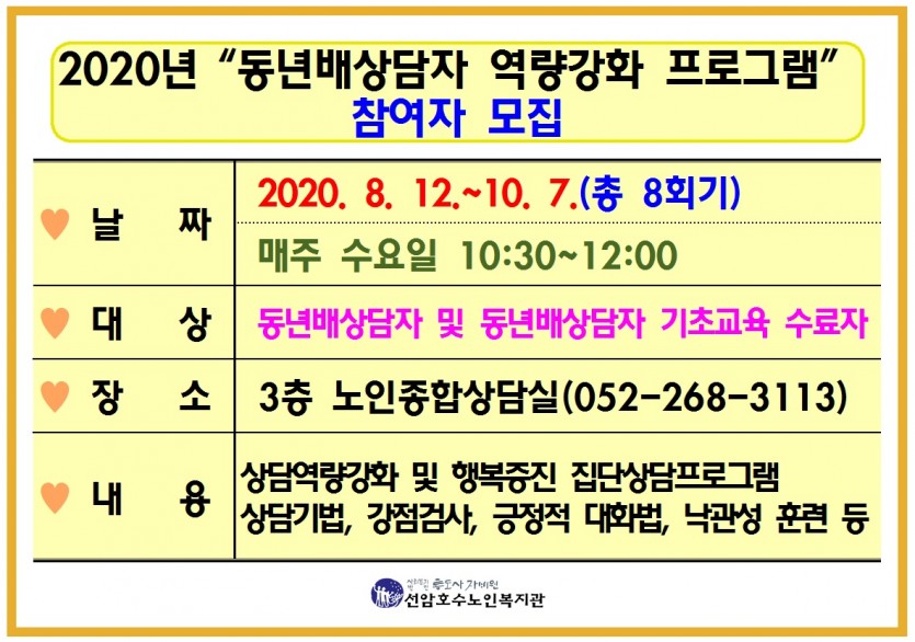 동년배상담자 역량강화 집단상담 프로그램 실시안내 페이지 정보 작성자 관리자 댓글 0건 조회Hit 654회 작성일Date 20-08-05 10:53 본문 동년배상담자 역량강화 집단상담 프로그램 실시 목록 댓글목록 댓글목록 등록된 댓글이 없습니다.