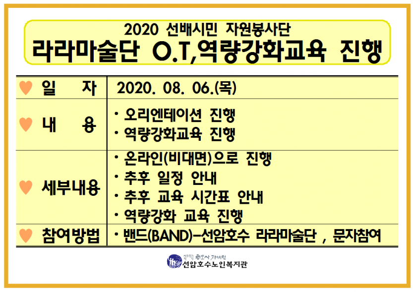 밴드 (BAND)- 선암호수 라라마술단 과 문자 를 통하여 공지 드렸으며 , 오리엔테이션 안내자료 확인과 교육이 모두 끝났을 때 댓글에 '확인했습니다' 라고 작성해주시기 바랍니다. 건강한모습으로 다음주 역량강화,양성교육에 뵙겠습니다~^^