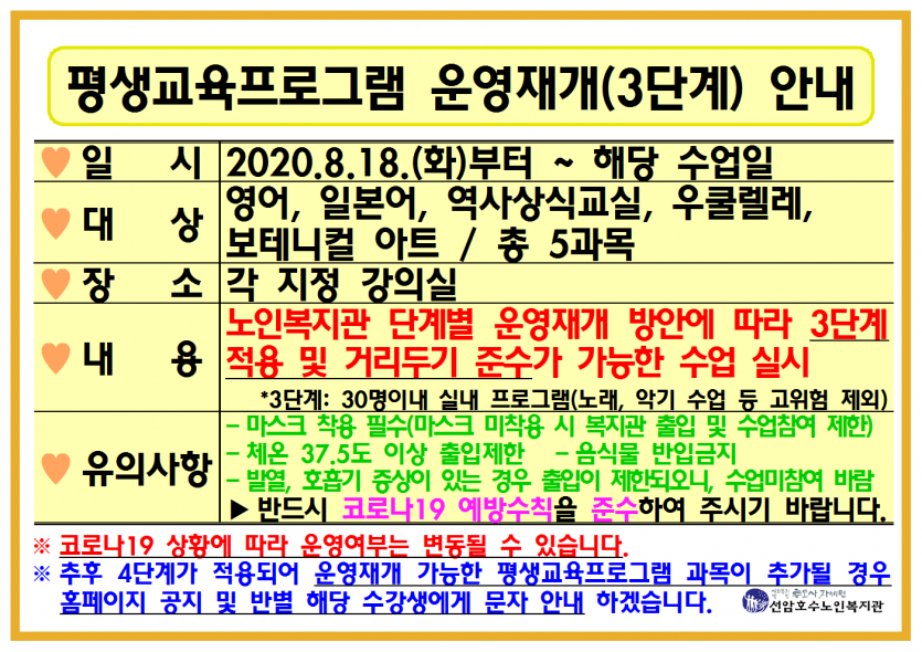 평생교육프로그램 운영재개(3단계) 안내 → 8/20(목)부터~ 잠정중단(휴강)