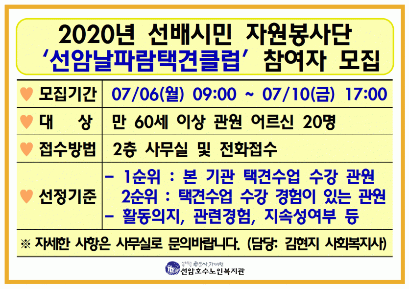 2020년 선배시민 자원봉사단 ‘선암날파람택견클럽’ 참여자 모집 페이지 정보 작성자 관리자 댓글 0건 조회Hit 680회 작성일Date 20-07-06 09:42 본문 2020년 선배시민 자원봉사단 ‘선암날파람택견클럽’ 참여자 모집 목록 댓글목록 댓글목록 등록된 댓글이 없습니다.