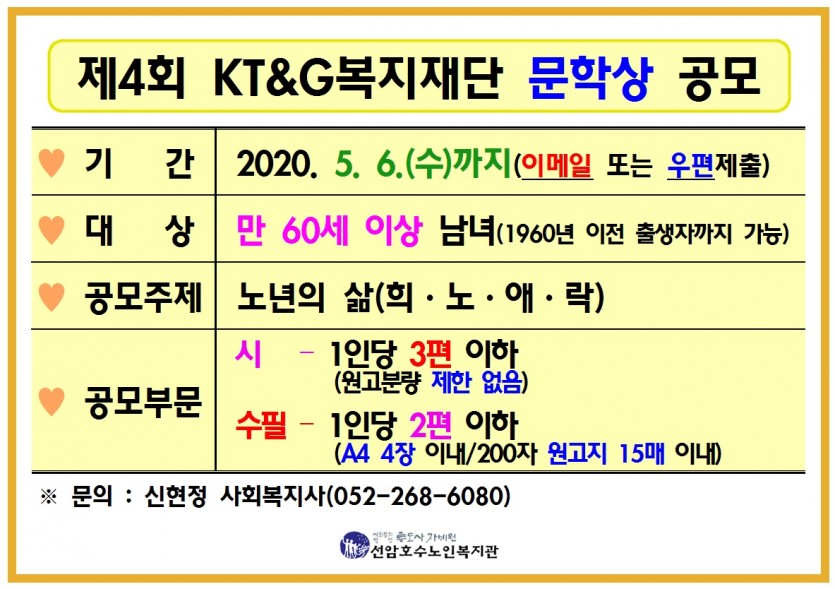 제4회 KT&G복지재단 문학상 공모 안내 페이지 정보 작성자 관리자 댓글 0건 조회Hit 583회 작성일Date 20-04-14 09:29 본문 제4회 KT&G복지재단 문학상 공모 안내 목록 댓글목록 댓글목록 등록된 댓글이 없습니다.